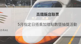 2026/5/5~5/31期間每週一至週四,透過合作飯店官網訂房並加購高鐵車票,即可享TGo會員點數10%加碼回饋,並獲得飯店餐券抽獎資格(每筆訂單1次,共抽出20名),詳情請參考活動說明。